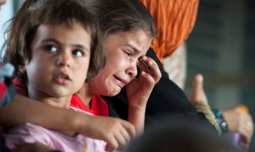 Garota segura cartaz, denunciando o Estado Islâmico e pedindo que impeçam o grupo de continuar agindo. (Foto: Reuters)