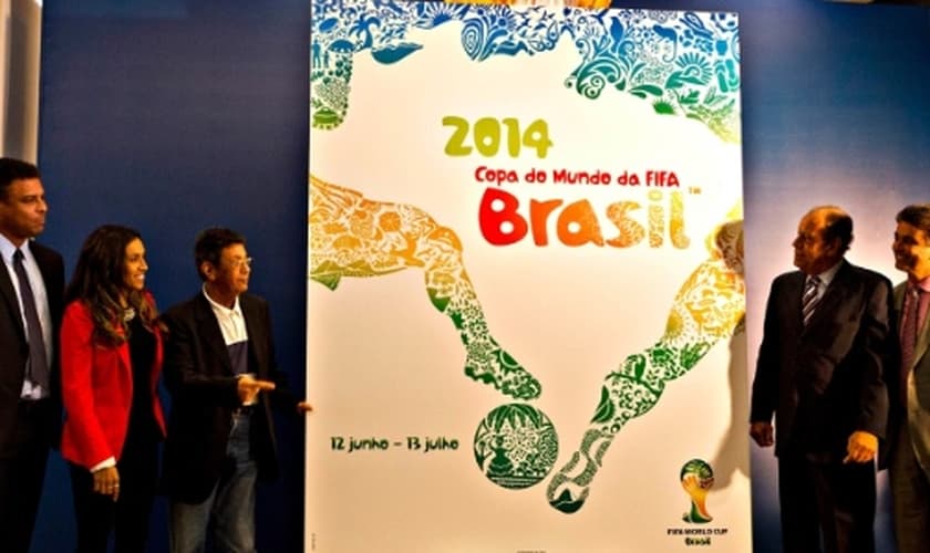 Foi divulgado nesta quarta-feira, no Rio de Janeiro, o pôster oficial da Copa do Mundo de 2014. A imagem é um mapa estilizado do Brasil, com os contornos definidos por desenhos de duas pernas disputando uma bola, além de imagens da fauna e da flora brasileira.