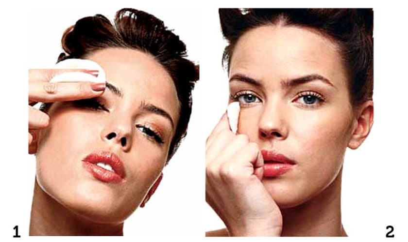 1. Molhe os dois lados de um chumaço de algodão com um demaquiante específico para a região dos olhos. Posicione-o logo abaixo da sobrancelha e faça um movimento descendente até a ponta dos cílios. Repita.