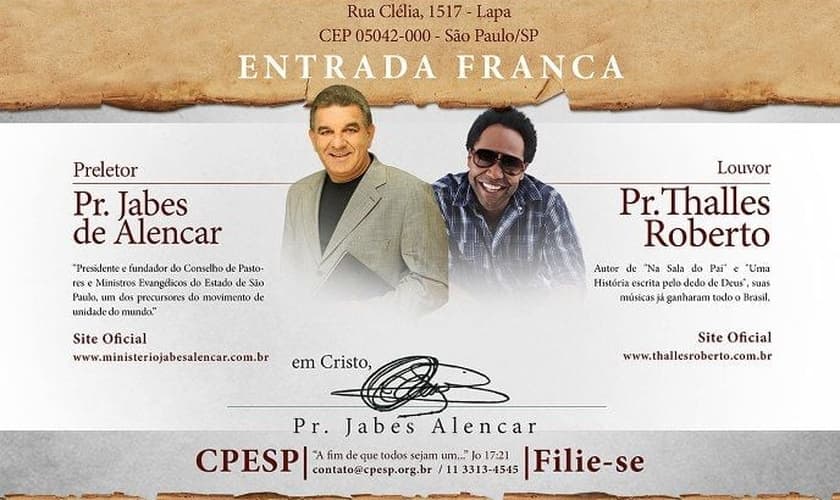 O preletor será o pastor Jabes de Alencar, presidente da CPESP. Thalles Roberto ministrará o louvor.