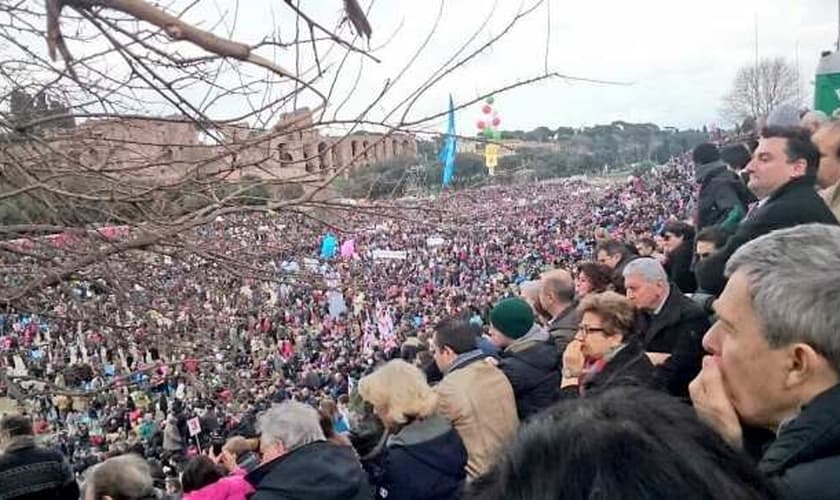 Enquanto o Parlamento Italiano se prepara para reconhecer dentro das "uniões civis" as uniões entre pessoas do mesmo sexo, uma multidão de centenas de milhares de pessoas se reuniu no Circus Maximus de Roma e nas ruas adjacentes no último sábado (30), para se manifestar a favor da família tradicional e dos direitos das crianças. Apesar de os organizadores da manifestação afirmara que quase dois milhões de pessoas participaram do evento, o conceituado jornal italiano 'La Stampa' informou que cerca de 300 mil pessoas estiveram no protesto.