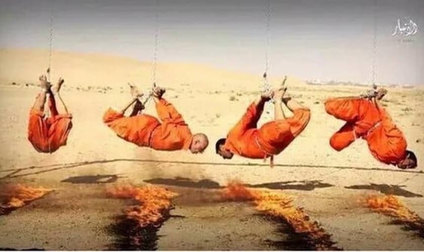 Mais um vídeo repugnante de novas mortes foi divulgado pelo Estado Islâmico. Dessa vez, quatro reféns foram acorrentados e ficaram suspensos pelos pés antes de serem queimados vivos.