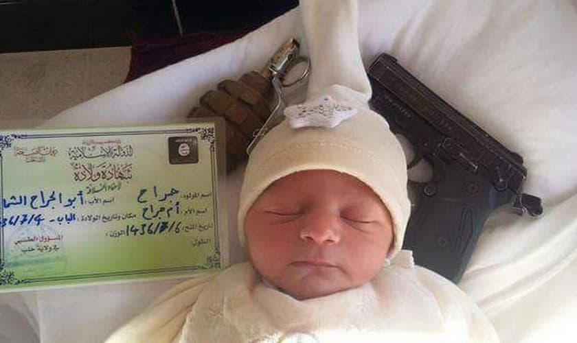 O grupo terrorista Estado Islâmico (EI) publicou na internet a foto de um bebê deitado ao lado de uma arma e uma granada, junto a uma certidão de nascimento do EI. A legenda da foto adverte que a criança vai crescer e se tornar uma ameaça.