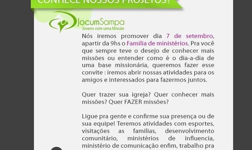 A Jocum Sampa - (Jovens Com Uma Missão) irá realizar uma ação para explicar melhor sobre trabalho missionário.