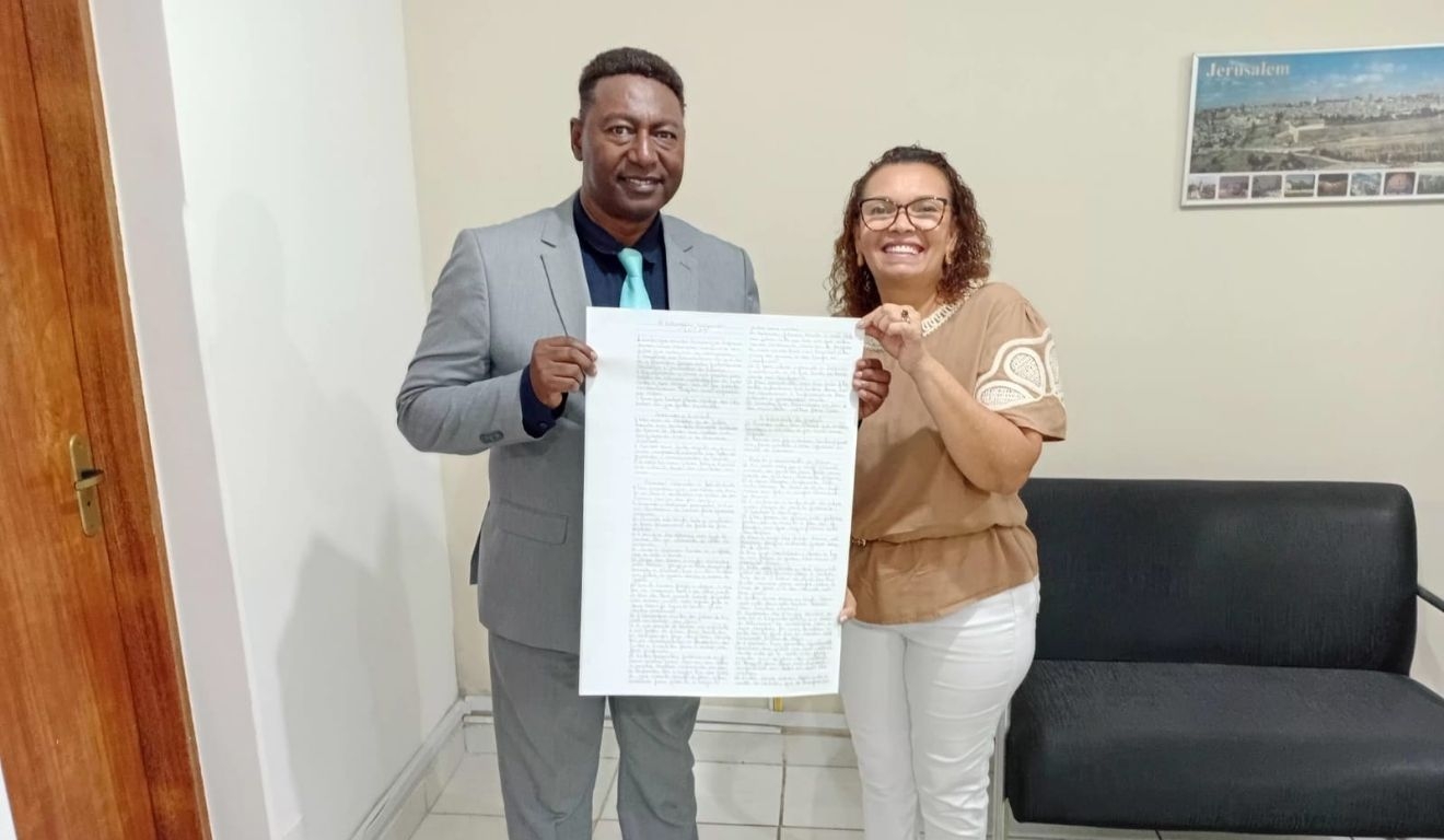 Pastor Walter Aguia e Cleia Monteiro exibem página da Bíblia gigante. (Foto: Arquivo pessoal)