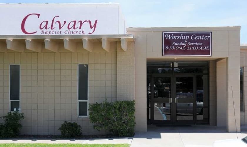 Carro da polícia de las Cruces, estacionado nas proximidades da igreja Batista 'Calvary'.