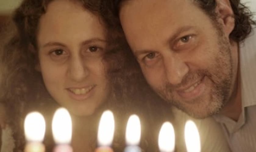 Liat e o pai, o rabino More Ventura, com o candelabro da celebração do Hanukkah
