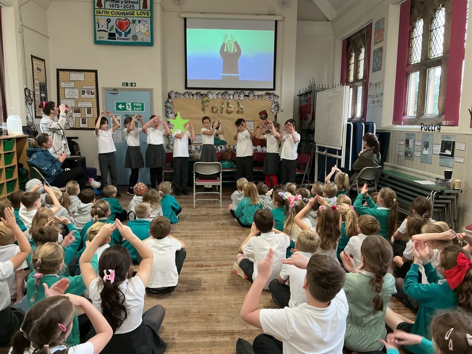 Alunos fazem a ‘Oração do Senhor’ junto com professora pelo telão. (Foto: Faith in the North)