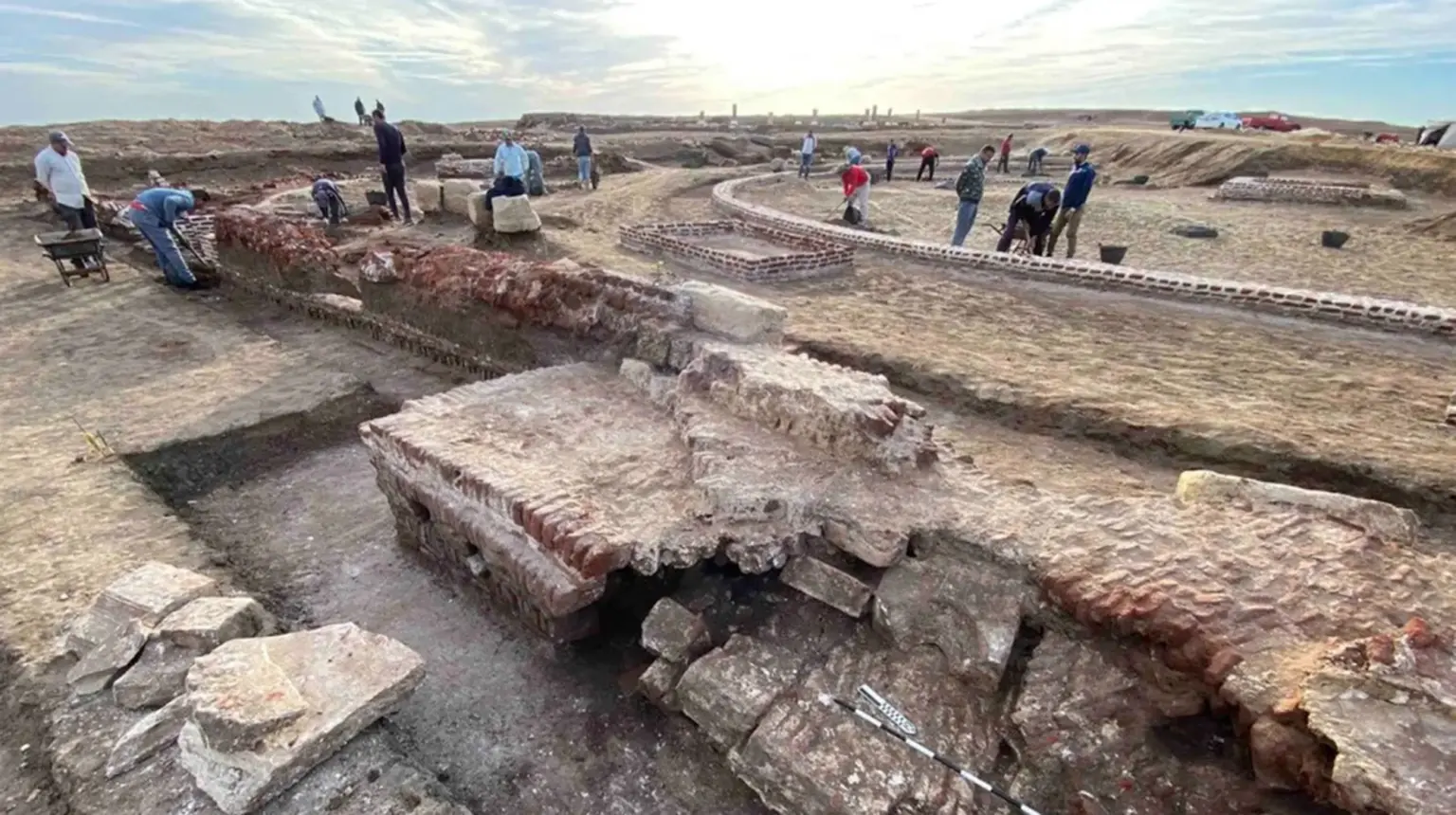 A recente escavação revelou uma enorme bacia com cerca de 35 metros de diâmetro, que era preenchida com água do rio Nilo. (Foto: Ministério do Turismo e Antiguidades do Egito)