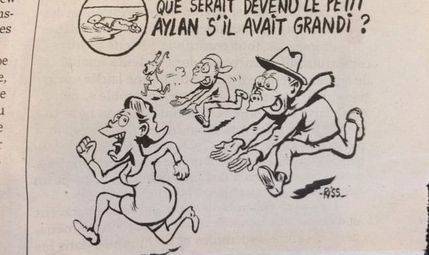 A referência ao pequeno Aylan é feita em um tipo de legenda que acompanha o desenho e questiona: "No que teria se transformado o pequeno Aylan se ele tivesse crescido?".