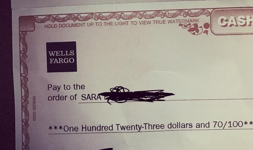 “Josh, não funciona assim”, respondeu Sara. Depois da conversa, eles chegaram em casa e encontraram um envelope no degrau da porta. Dentro do envelope, havia um cheque de 123 dólares vindo de uma parcela excedente de um empréstimo estudantil feito em 2007.