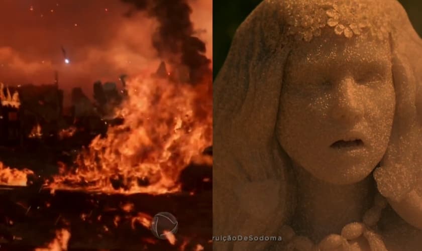 A cena de destruição de Sodoma e Gomorra foi exibida nesta terça-feira (26) pela Record TV na novela Gênesis. Com base no relato bíblico, as duas cidades foram destruídas por Deus com fogo e enxofre caídos do céu, por causa de seus pecados.