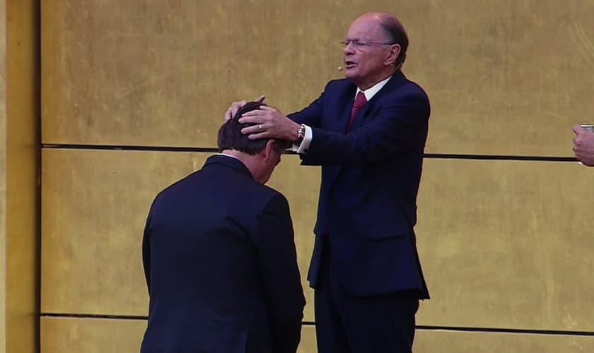 Diante de quase 10 mil fiéis, por volta das 10h, o presidente se ajoelhou no altar e foi ungido com óleo por Macedo.