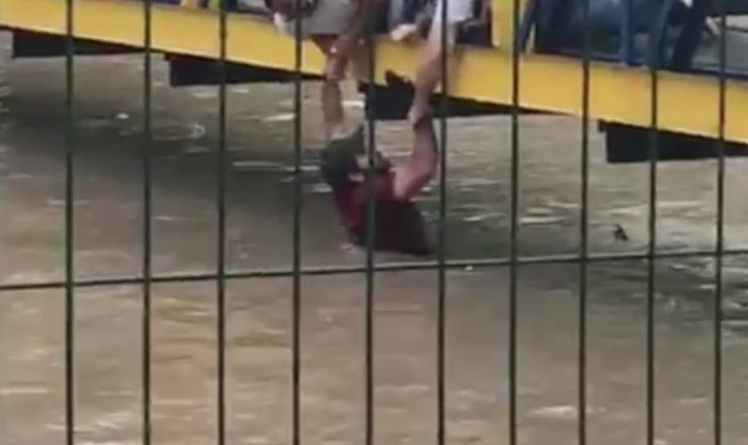 O professor foi tirado da correnteza por três pessoas que estavam na passarela sobre o canal. Confira no vídeo abaixo: