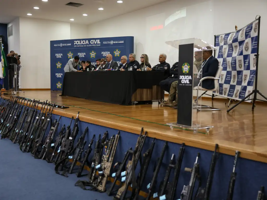 Mesa com autoridades do Estado do Rio de Janeiro durante coletiva de imprensa sobre a Operação Contenção na Cidade da Polícia, no Rio de Janeiro. (Foto: Reprodução/Agência Brasil)