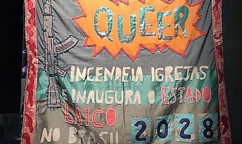 "Exército Queer incendeia igreja e inaugura o Estado Laico no Brasil. 2028", diz a inscrição da obra, que também apresenta a figura de uma metralhadora ao lado da frase.