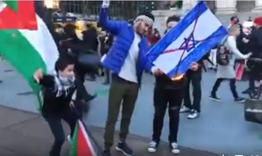 Após o reconhecimento de Jerusalém como capital de Israel pelo governo Trump, as ameaças de intimidação e violência em manifestações de antissemitismo continuam, não somente no Oriente Médio, mas também no Ocidente. Nesta cena registrada em Vancouver (Canadá), por exemplo, Palestinos queimam e pisoteiam a bandeira de Israel em frente a um jovem judeu, que não se intimida e permanece segurando outra bandeira de seu país com os braços abertos.