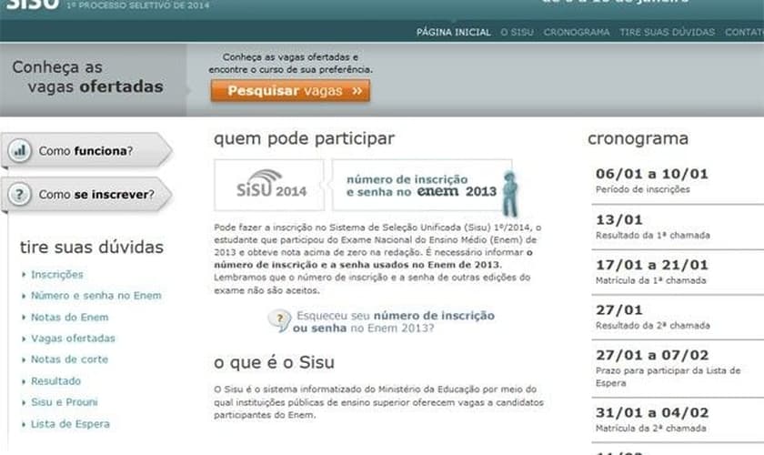 Somente poderá se inscrever no processo seletivo do Sisu referente à primeira edição de 2014 o estudante que tenha participado da edição do Exame Nacional do Ensino Médio (Enem) de 2013 e que tenha obtido nota acima de zero na prova de redação. O Ministério da Educação anunciou que vai divulgar a nota do Enem até o final desta semana. Pela lei federal de cotas, o Sisu deve reservar pelo menos 25% das vagas para alunos que fizeram todo o ensino médio em escolas públicas.