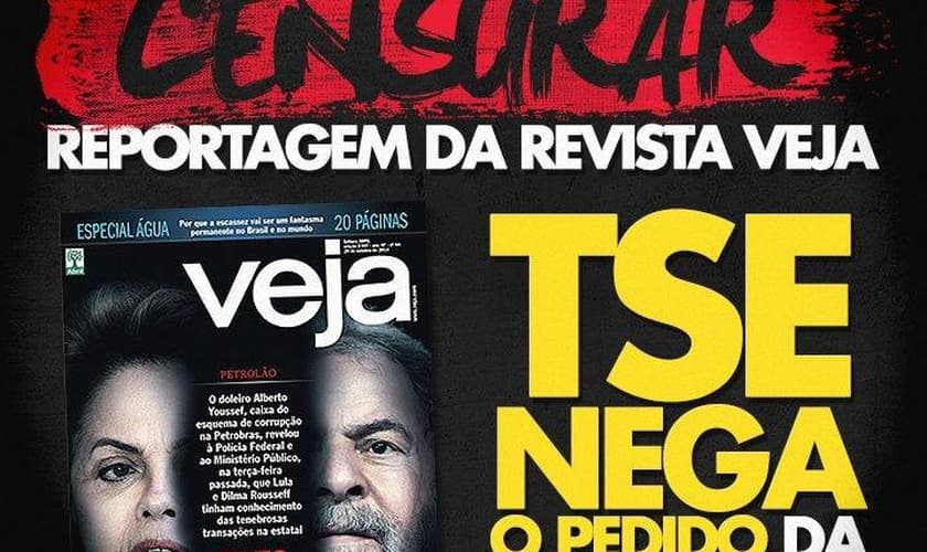 O ministro Admar Gonzaga, do Tribunal Superior Eleitoral (TSE), negou nesta sexta-feira o pedido de liminar feito pela campanha da presidente Dilma Rousseff de retirada da publicação da reportagem da revista “Veja”, publicada no site e no Facebook da revista, que traz informação atribuída ao doleiro Alberto Youssef de que Dilma e o ex-presidente Luiz Inácio Lula da Silva sabiam do esquema de corrupção na Petrobras. Para negar o pedido, o ministro Admar Gonzaga justificou que o artigo da lei eleitoral citado na representação (art. 57-D, § 3º, da Lei das Eleições) para pedir a retirada do ar não está em vigor nas eleições deste ano. Ele arquivou a representação, sem julgamento do mérito.