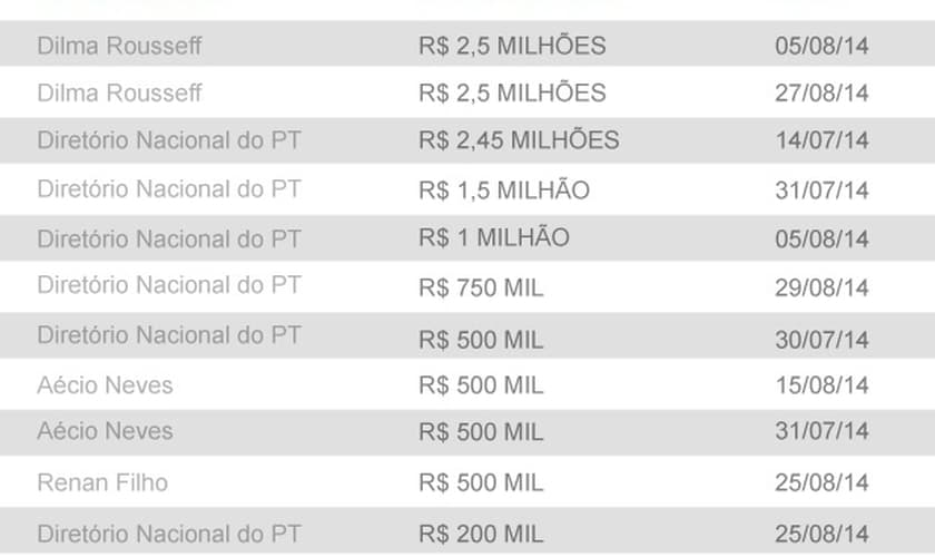O maior beneficiado da empreiteira foi o Diretório Nacional do PT, que recebeu seis transferências bancárias entre os dias 14 de julho e 29 de agosto. Os valores variaram entre R$ 200 mil e R$ 2,45 milhões, totalizando transferências no montante de R$ 6,4 milhões.