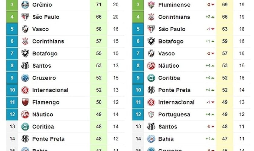 Vale lembrar que os quatro primeiros colocados no Brasileirão foram Fluminense, com 77 pontos; Atlético-MG, com 72; Grêmio, com 71; e São Paulo, com 66.