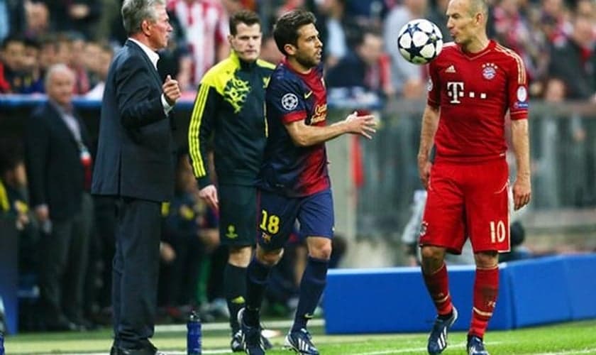 Franck Ribery tenta desarmar Pedro no duelo entre Bayern de Munique e Barcelona