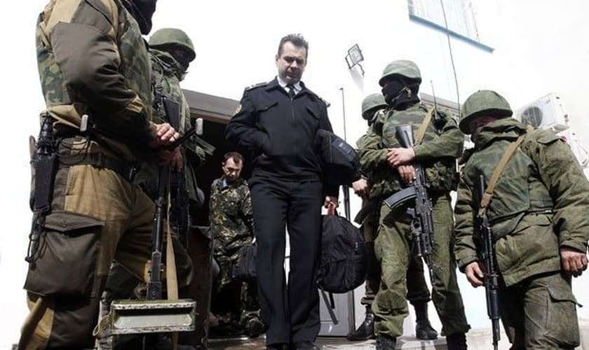 Oficiais ucranianos, desarmados e vestidos com roupas civis, começaram a deixar o prédo após o domínio do local por forças russas, segundo a Reuters.