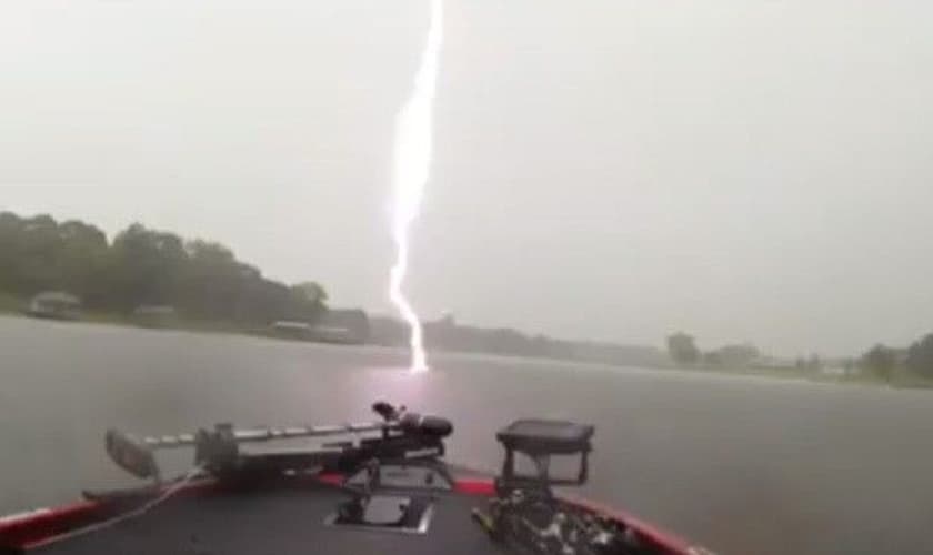 O jovem Tucker Owings, pescador profissional de apenas 16 anos, levou um grande susto enquanto pescava no lago Athens, no Texas (EUA), quando um raio caiu a poucos metros dele, em um momento assustador registrado por uma câmera colocada no barco (assista).