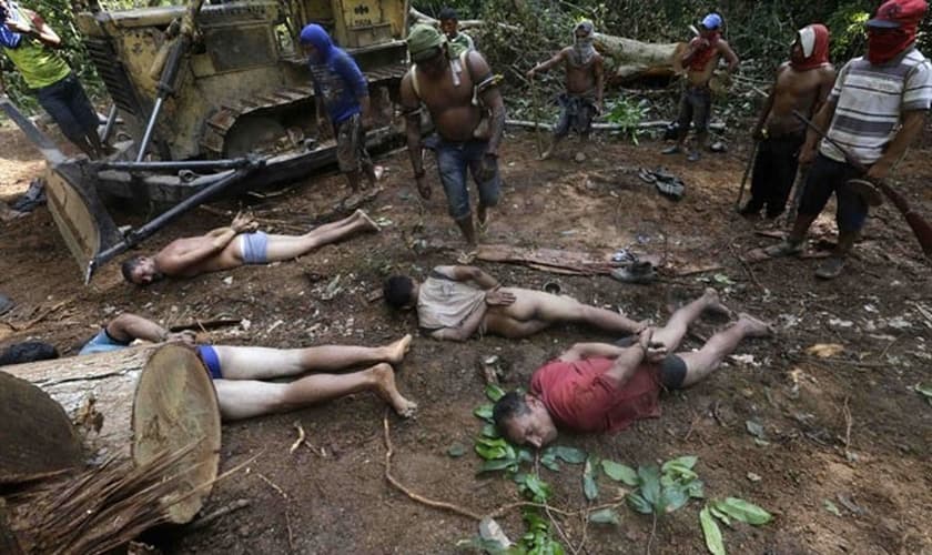 Imagens divulgadas nesta quinta-feira (4) pela agência Reuters mostram índios da etnia Ka’apor em operação realizada por eles contra madeireiros que agiam no interior da Terra Indígena Alto Turiaçu, nas proximidades de Centro do Guilherme, cidade com pouco mais de 12 mil habitantes localizada no Maranhão.