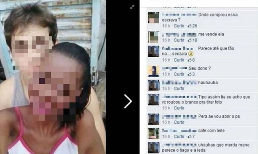 A foto foi postada na semana passada, pela jovem, em seu perfil no Facebook, e ela logo começou a receber comentários preconceituosos, como um em que dizia que ela havia “roubado um branco para fazer a foto”. Outro dirigia-se ao namorado, perguntando: “Onde comprou essa escrava?”.