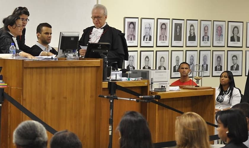 Bruno fica de cabeça baixa no plenário onde é realizado o julgamento