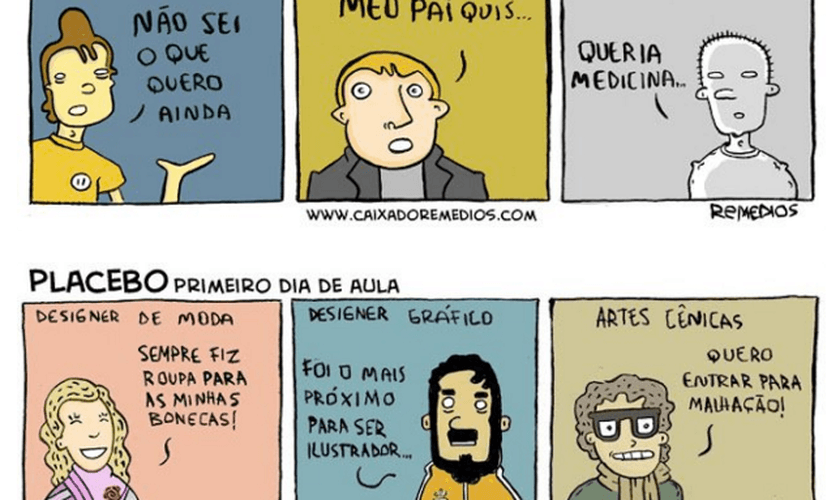O cartunista que produz as tirinhas do Caixa do Remédios fez uma série de ilustrações que definem, de modo descontraído, o que os estudantes falam no primeiro dia de aula de vários cursos.