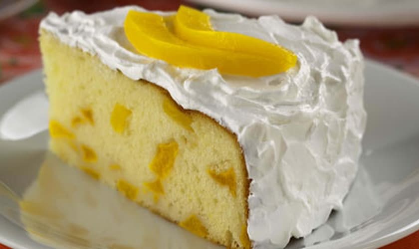Misture bem e reserve. Em um pirex retangular, coloque fatias do bolo, molhe-as com a calda do pêssego, coloque uma camada de creme e vá alternando até o bolo acabar. A última camada tem que ser de creme. Cubra com papel alumínio e leve à geladeira.