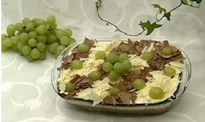 Então, faça a montagem do prato. Disponha a bolacha doce no fundo da travessa. Coloque a uva cortada ao meio em volta para não rolar no prato. Jogue o chocolate meio amargo por cima. Encerre com a camada branca. Leve o prato para a geladeira por uma hora. Pode-se usar as raspas dos dois chocolates e as uvas para decorar. Fica geladinho e macio.