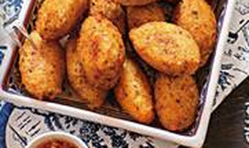 Preparar o arroz um dia antes. Passar no moedor de carnes ou em um processador o arroz, o presunto e os queijos. Depois de moídos, adicionar os ovos, a margarina, a salsa e o orégano. Misturar bem e fazer bolinhas. Frite.