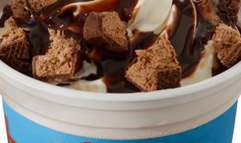 O sorvete mistura sorvete de baunilha, calda de chocolate e o chocolate.