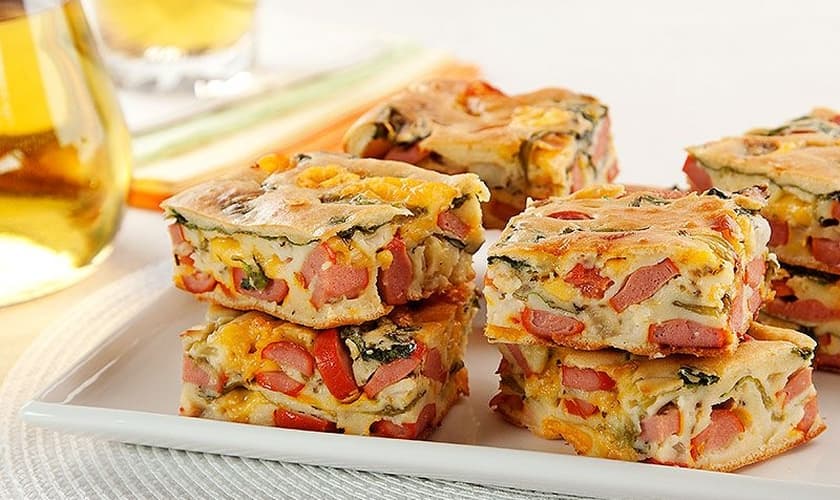 Para a massa, misture em uma tigela ou no liquidificador o leite, ovos, óleo e misture bem, junte o queijo ralado, amido de milho e a farinha de trigo e misture bem para incorporar todos os ingredientes.
