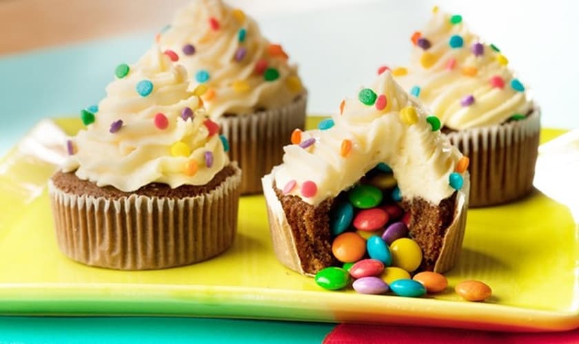 Com uma colher de chá, faça uma cavidade na parte de cima de cada bolinho. Nela, coloque os confeitos de chocolate e cubra com o glacê. Decore com os confeitos coloridos e sirva em seguida.