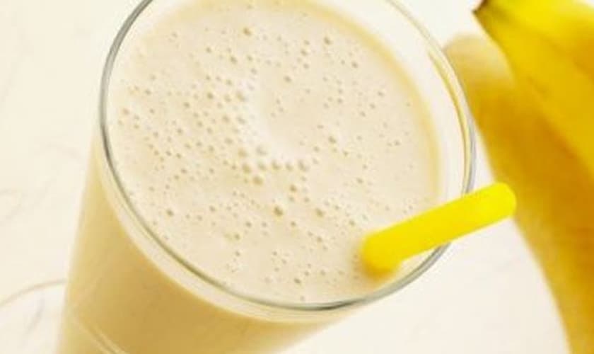 Num liquidificador, coloque banana amassada com o garfo e sorvete de creme e bata bem.