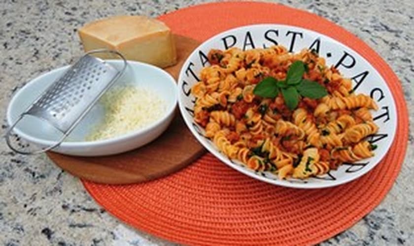 Acrescente o tomate em cubos, oextrato de tomate, o caldo de legumes e a água. Cozinhe em fogo médio com apanela tampada mexendo ocasionalmente até obter um molho encorpado. Junte ostemperos verdes, a massa cozida e finalize com queijo ralado.