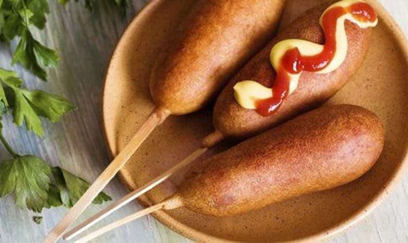 Em uma tigela, coloque a farinha de milho, a farinha de trigo, o açúcar, o fermento e o sal. Misture tudo usando uma colher grande. Junte o ovo, o leite e misture mais até que fique uma massa homogênea. Despeje a massa em uma jarra alta e leve para refrigerar pelo tempo que for necessário. Pré-aqueça o óleo em uma panela funda e em fogo médio, se utilizar uma frigideira tome cuidado para dourar todos os lados. Use papel toalha para secar as salsichas para a massa aderir melhor. Insira um espeto nas salsichas e mergulhe na massa fria. Cubra bem toda a salsicha. Depois, passe a salsicha no queijo ralado, na farinha e no macarrão. Em seguida coloque no óleo por 3 minutos ou até dourar. Escorra em um papel toalha e sirva.