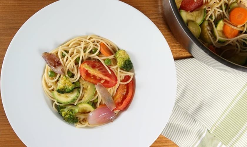 Quando o caldo dos vegetais tiver reduzido, junte à panela a massa e misture, para que se combinem.