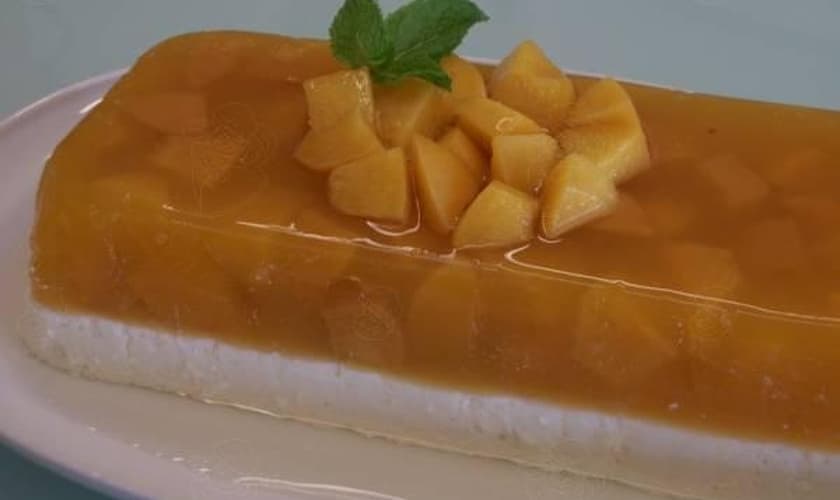 - Desenformar,servir com o pêssego picadinho e a calda restante