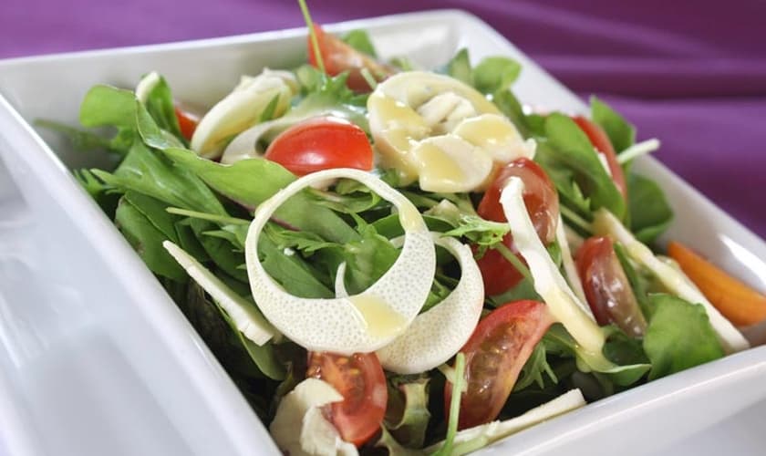 Rasgue as folhas em pedaços grandes, fatie a cebola roxa e corte os tomates cereja ao meio. A abobrinha também deve ser cortada em pedaços pequenos.