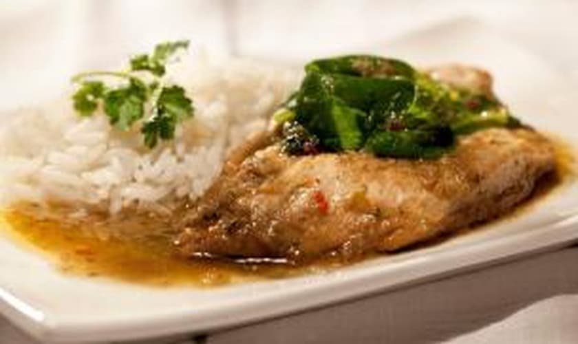 Num processador coloque o gengibre, o capim limão, a pimenta e a hortelã. Misture até ficar uma pasta. Coloque a mistura processada em uma frigideira em fogo médio com o óleo. Adicione o frango e refogue por 2 minutos cada lado da carne. Coloque o leite de coco e o café e deixe cozinhar até o frango ficar tenro (mais ou menos sete minutos). Por fim, acrescente as folhas de espinafre e tampe a frigideira por 1 minuto. Desligue o fogo. Sirva com arroz e folhas de coentro.
