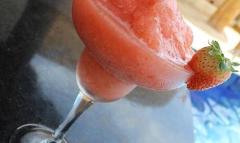 Bata todos os ingredientes, exceto o gelo, no liquidificador. Para conseguir a consistência, que deve se assemelhar à de uma raspadinha, vá colocando o gelo aos poucos e batendo, até alcançar o ponto.