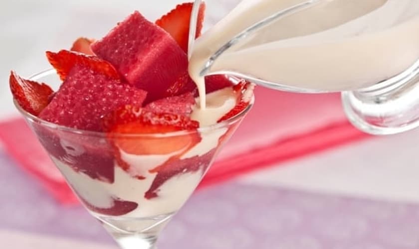 Sobremesa de morango - forre as taças com as frutas higienizadas e cortadas ao meio. Faça uma receita de brigadeiro branco misturando ao fogo, sem parar de mexer, 1 lata de leite condensado e 1 colher (sopa) de margarina até alcançar o ponto mole. Desligue o fogo e acrescente 1 lata de creme de leite. Despeje o brigadeiro branco sobre os morangos e cubra com chocolate ao leite derretido, misturado com creme de leite. Leve para gelar.