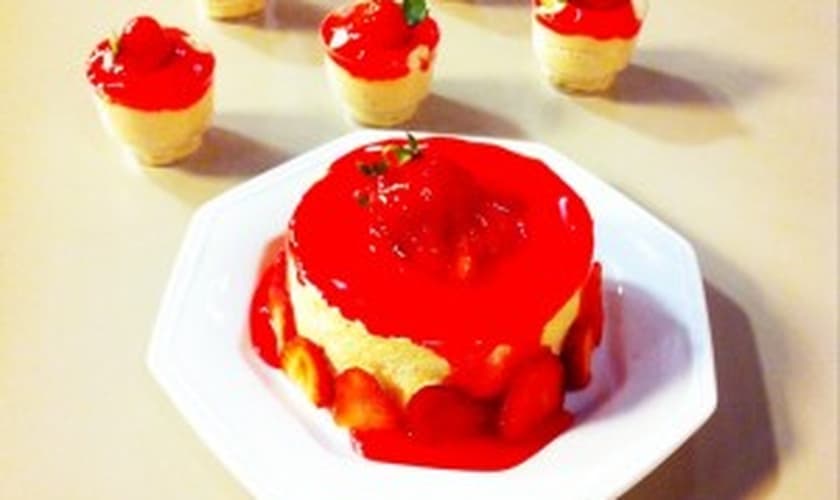 Em uma tigela, misture o doce leite com o chantilly e a gelatina dissolvida. Em uma aro de 22 cm de diâmetro, coloque o pão de ló, o creme e leve para gelar por 2 horas. Desenforme, coloque os morangos em cima do mousse e pincele com o gel de brilho.