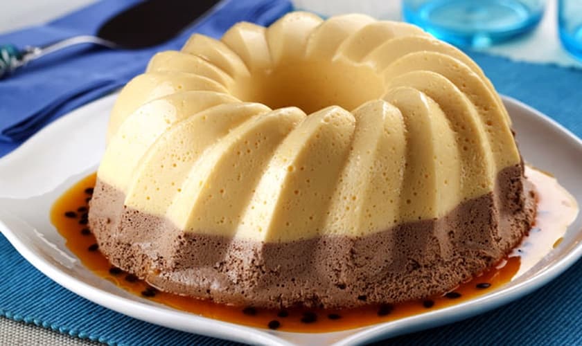 Derreta o chocolate em banho-maria. No liquidificador, bata o creme de leite, o chocolate derretido e a gelatina hidratada e dissolvida de acordo com as instruções da embalagem. Acrescente as claras batidas em neve e misture delicadamente. Coloque sobre o pudim de maracujá, completando a forma e leve a geladeira até ficar bem firme. Desenforme e sirva em seguida.