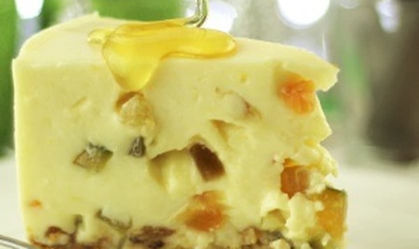 Incorpore a ele a gelatina e as frutas cristalizadas. Despeje o creme sobre a base feita com o panetone e leve à geladeira até firmar bem. Ao servir, despeje uma colher (sopa) de mel sobre cada fatia.
